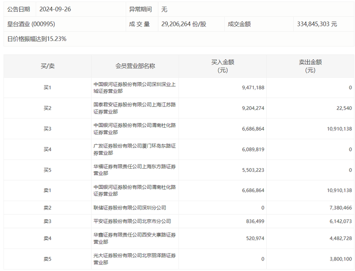 皇台酒业今日涨停,龙虎榜数据显示,上榜营业部席位全天成交7105.09万元,占当日总成交金额比例为21.22%。其中,买入金额为3831.28万元,卖出金额为3273.8万元,合计净买入557.48万元。