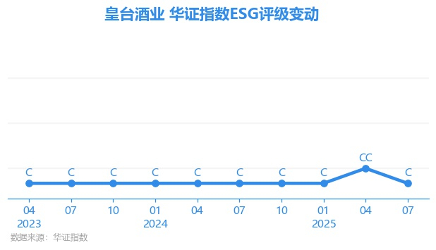 日前,华证指数公布了新一期(2025年7月31日)的ESG评级结果,皇台酒业(000995.SZ)获得C评级(华证指数评级为C起至AAA九档,C为最低档,AAA为其最高一级评级/AA为其第二档),上一期(2025年4月30日)ESG评级为CC。本期ESG评级在50家饮料行业A股上市公司中排名第45(上一期排名第46)。