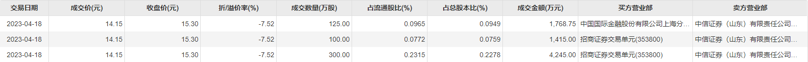 4月18日大宗交易成交525万股,成交额7428.75万元,占当日总成交额的16.66%,成交价14.15元,较市场收盘价15.3元折价7.52%。
