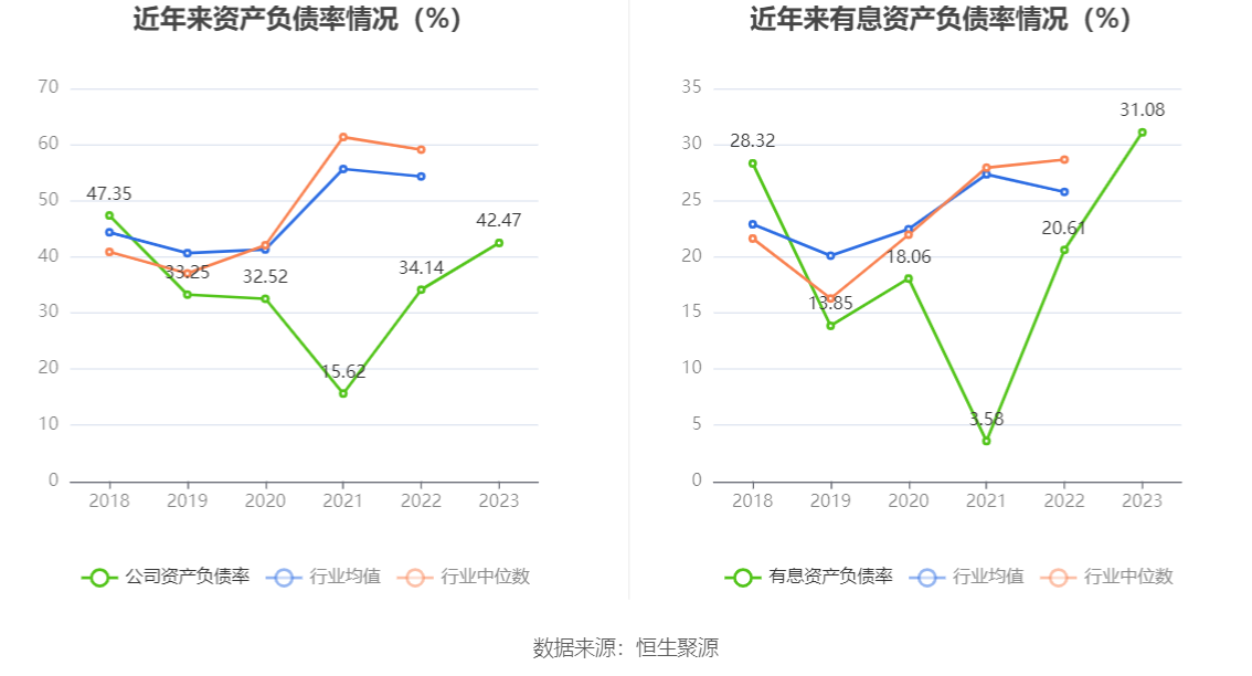 在偿债能力方面,公司2023年年末资产负债率为42.47%,相比上年末上升8.33个百分点;有息资产负债率为31.08%,相比上年末上升10.47个百分点。