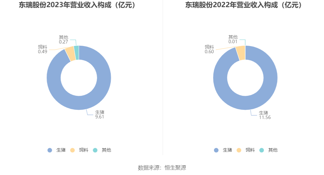 分产品来看,2023年公司主营业务中,生猪收入9.61亿元,同比下降16.88%,占营业收入的92.69%;饲料收入0.49亿元,同比下降18.22%,占营业收入的4.70%。