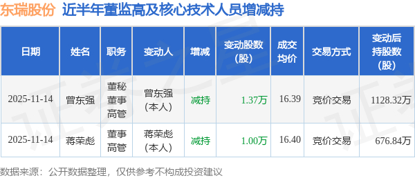 东瑞股份:11月14日高管曾东强、蒋荣彪减持股份合计2.37万股