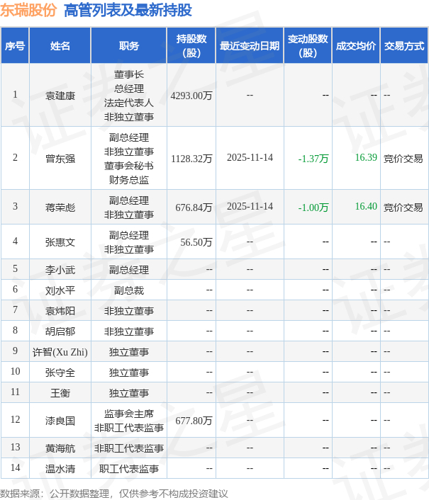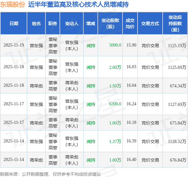 东瑞股份近半年内的董监高及核心技术人员增减持详情如下: