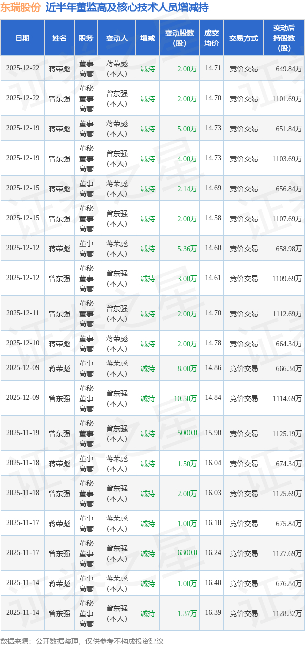 东瑞股份:12月22日高管曾东强、蒋荣彪减持股份合计4万股