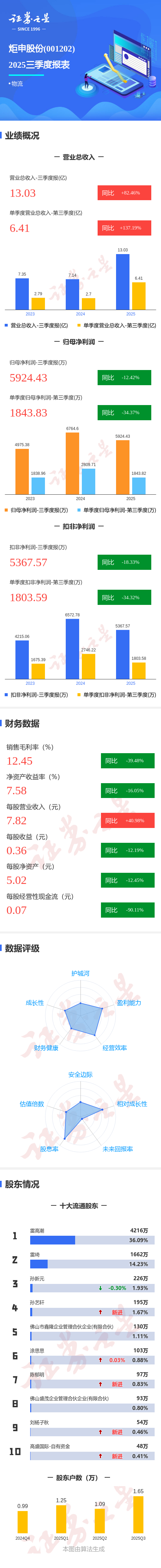 证券之星消息,炬申股份2025年三季报显示,前三季度公司主营收入13.03亿元,同比上升82.46%;归母净利润5924.43万元,同比下降12.42%;扣非净利润5367.57万元,同比下降18.34%;其中2025年第三季度,公司单季度主营收入6.41亿元,同比上升137.2%;单季度归母净利润1843.83万元,同比下降34.38%;单季度扣非净利润1803.59万元,同比下降34.32%;负债率55.2%,财务费用1709.87万元,毛利率12.45%。