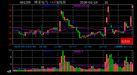 截止收盘,博菲电气报收41.48元/股,涨幅10.0%,成交量4万手,成交额1.86亿元,换手率6.36%。今日2板。