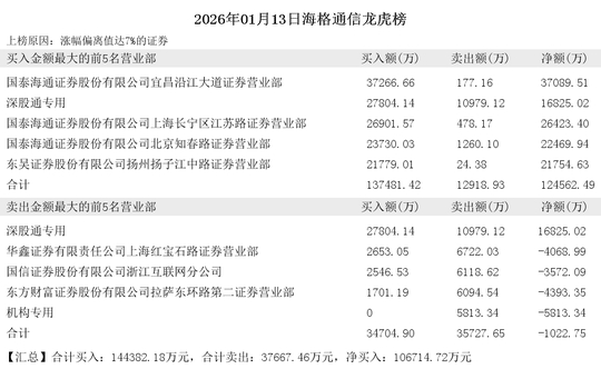 卖出前5席为:深股通专用、华鑫证券有限责任公司上海红宝石路证券营业部、国信证券股份有限公司浙江互联网分公司、东方财富证券股份有限公司拉萨东环路第二证券营业部、机构专用。共计买入:34704.90万元,共计卖出:35727.65万元。
