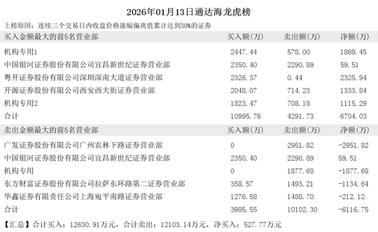 买入前5席为:机构专用1、中国银河证券股份有限公司宜昌新世纪证券营业部、粤开证券股份有限公司深圳深南大道证券营业部、开源证券股份有限公司西安西大街证券营业部、机构专用2。共计买入:10995.76万元,共计卖出:4291.73万元。