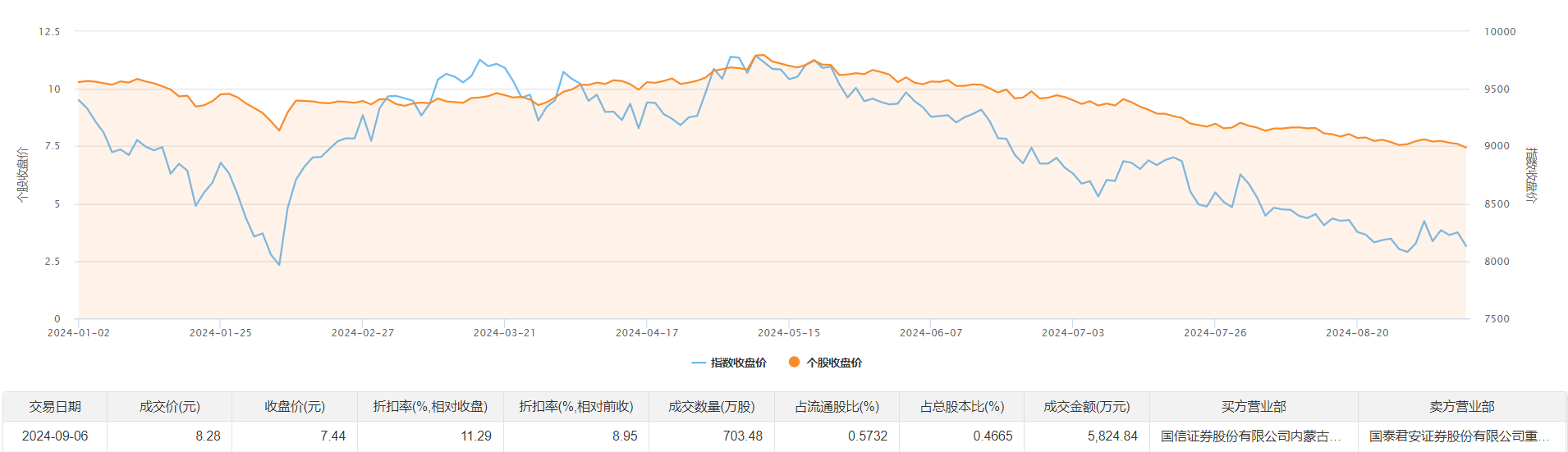 9月6日大宗交易成交703.48万股,成交额5824.84万元,占当日总成交额的53.49%,成交价8.28元,较市场收盘价7.44元溢价11.29%。