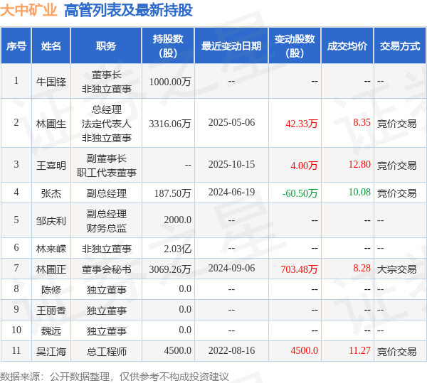 大中矿业近半年内的董监高及核心技术人员增减持详情如下:
