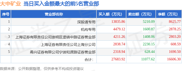 证券之星消息,沪深交易所2025年10月31日公布的交易公开信息显示,大中矿业(001203)因日涨幅偏离值达到7%的前5只证券登上龙虎榜。此次是近5个交易日内第2次上榜。