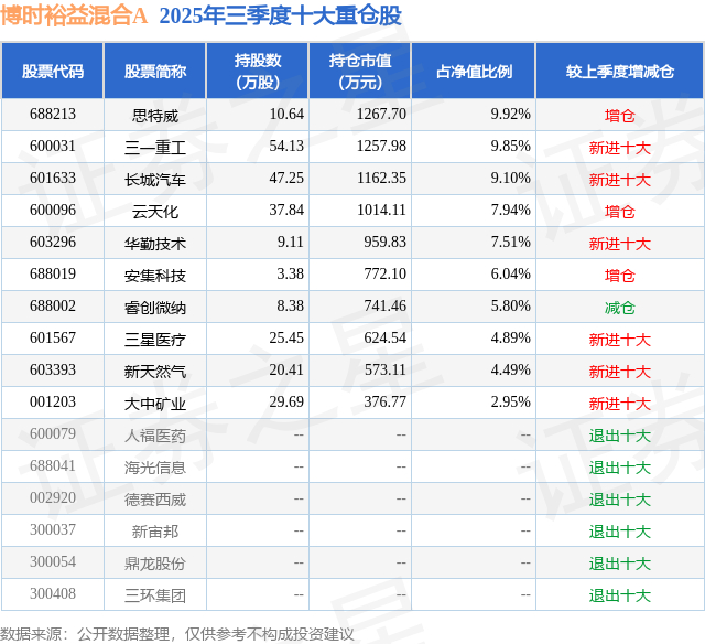根据2025基金Q3季报公募基金重仓股数据,重仓该股的公募基金共1家,其中持有数量最多的公募基金为博时基金的博时裕益混合A。博时裕益混合A目前规模为1.28亿元,最新净值2.9674(11月21日),较上一交易日下跌2.22%,近一年上涨26.6%。该公募基金现任基金经理为王冠桥。
