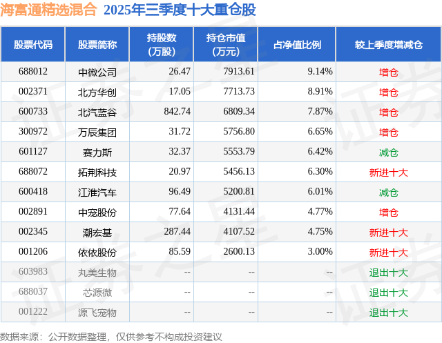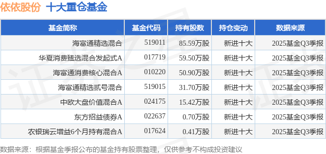 根据2025基金Q3季报公募基金重仓股数据,重仓该股的公募基金共7家,其中持有数量最多的公募基金为海富通基金的海富通精选混合。海富通精选混合目前规模为8.66亿元,最新净值0.5755(11月7日),较上一交易日下跌0.52%,近一年上涨2.86%。该公募基金现任基金经理为黄峰。黄峰在任的基金产品包括:海富通内需热点混合,管理时间为2014年12月17日至今,期间收益率为124.22%;海富通精选贰号混合,管理时间为2019年6月3日至今,期间收益率为75.76%;海富通消费核心混合A,管理时间为2020年11月4日至今,期间收益率为5.36%。