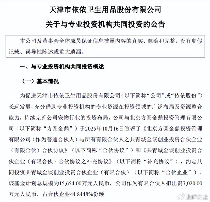 而依依股份的扩张步伐不止于高爷家。2025年10月,依依股份宣布,与北京方圆金鼎投资管理有限公司共同投资共青城金谈创业投资合伙企业(有限合伙),基金计划总规模约为1.57