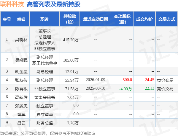 联科科技近半年内的董监高及核心技术人员增减持详情如下: