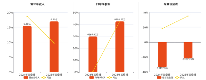 公司营业总收入为6.91亿元。归母净利润为8980.32万元。经营活动现金净流入为-6428.76万元。