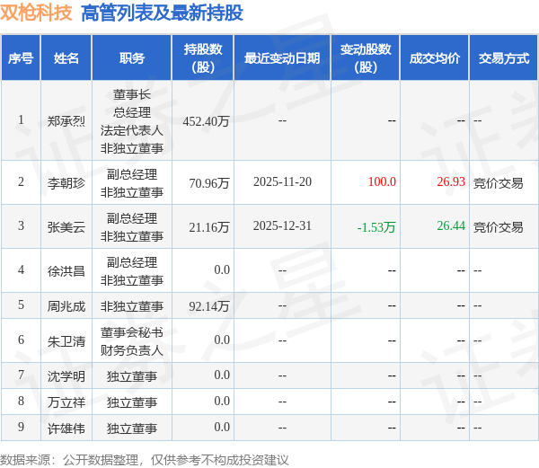 双枪科技的高管列表及最新持股情况如下: