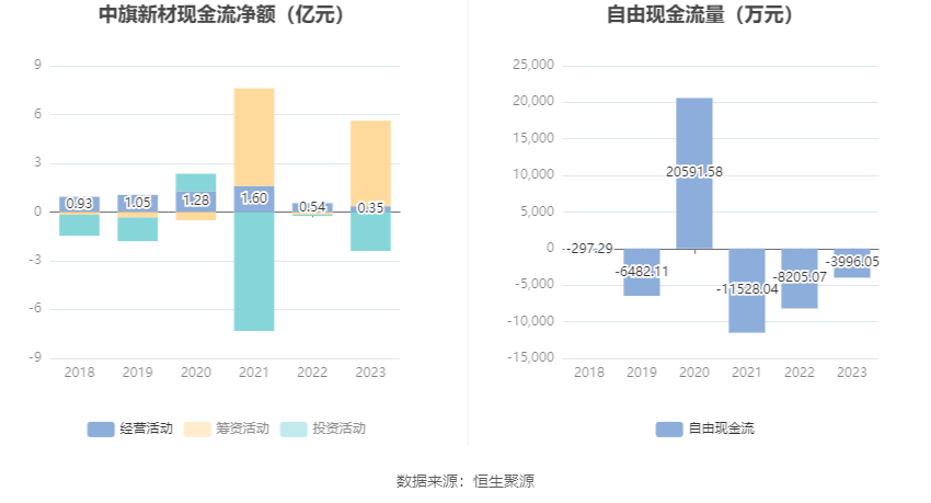 2023年,公司经营活动现金流净额为3504.72万元,同比下降35.28%;筹资活动现金流净额5.27亿元,同比增加5.44亿元;投资活动现金流净额-2.40亿元,上年同期为-820.02万元。