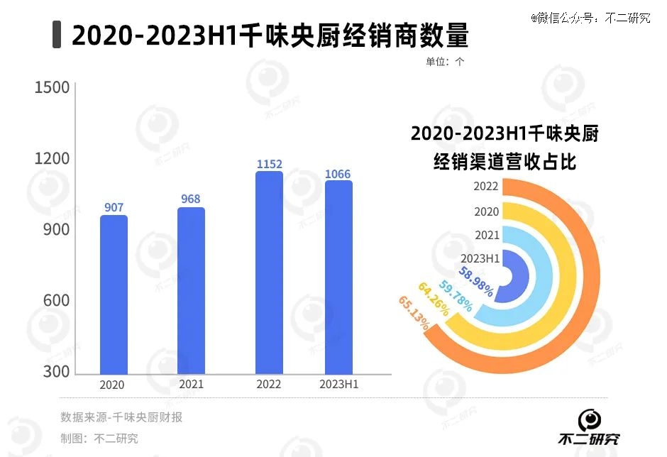其中核心原因除了2023年上半年大B用户受社会餐饮渠道影响较严重导致需求下降外,千味央厨经销商个数的下滑亦。据其招股书及财报显示,2022-2023年,千味央厨经销商数量由1152个下滑至1066个。