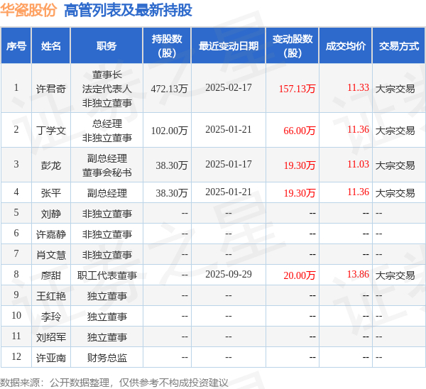 华瓷股份近半年内的董监高及核心技术人员增减持详情如下: