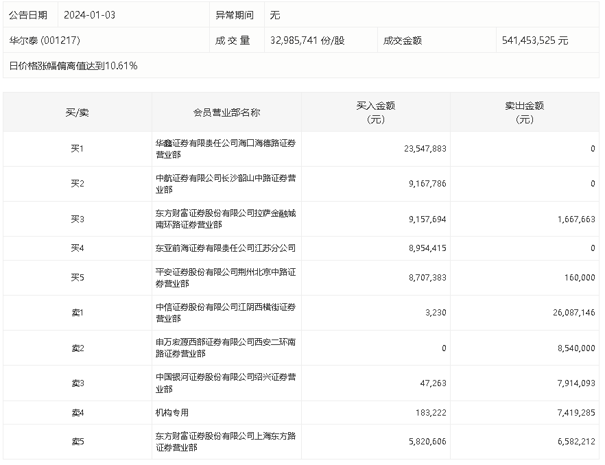 1月3日,华尔泰今日涨停,龙虎榜数据显示,上榜营业部席位全天成交1.24亿元,占当日总成交金额比例为22.89%。其中,买入金额为6558.95万元,卖出金额为5837.04万元,合计净买入721.91万元。