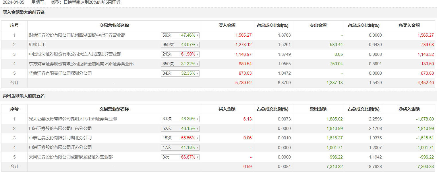 华尔泰1月5日跌8.14%,全天换手率达38.74%,振幅达12.97%。龙虎榜数据显示,营业部席位合计净卖出2850.94万元。其中,机构买入1273.12万元,卖出536.44万元,合计净买入736.68万元。此外,光大证券昆明人民中路证券营业部、申港证券广东分公司分别卖出1885.02万元、1810.99万元;财信证券杭州西湖国贸中心证券营业部、中国银河证券大连人民路证券营业部分别买入1565.27万元、1146.97万元。