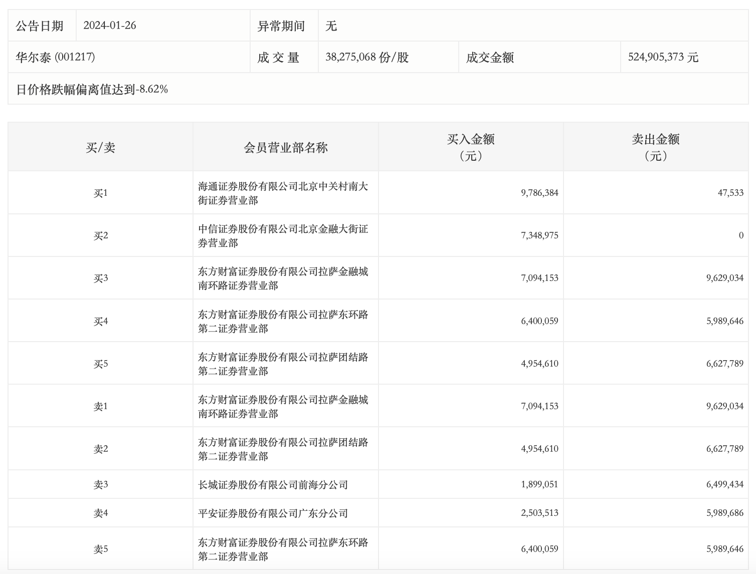 1月26日,华尔泰今日跌9.33%,全天换手率达28.79%,振幅达9.74%。龙虎榜数据显示,营业部席位合计净买入520.36万元。其中,东方财富证券拉萨金融城南环路证券营业部、东方财富证券拉萨团结路第二证券营业部分别卖出962.90万元、662.78万元;海通证券北京中关村南大街证券营业部、中信证券北京金融大街证券营业部分别买入978.64万元、734.90万元。