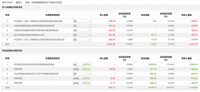 2月6日,青岛食品今日跌停,全天换手率达12.76%,振幅达6.3%。龙虎榜数据显示,营业部席位合计净卖出2207.86万元。其中,机构买入220.14万元,卖出1886.09万元,合计净卖出1665.95万元。此外,申万宏源证券有限公司深圳彩田路证券营业部、光大证券江门开平光明路证券营业部分别卖出2095.18万元、668.47万元;中信证券(山东)青岛南京路证券营业部、中泰证券新泰府前街证券营业部分别买入700.45万元、547.05万元。