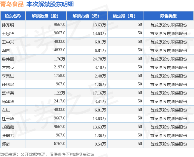 青岛食品(001219)9.8万股限售股将于12月19日解禁,占总股本0.05%