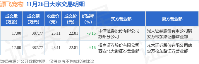 11月26日源飞宠物发生2笔大宗交易 成交金额775.54万元