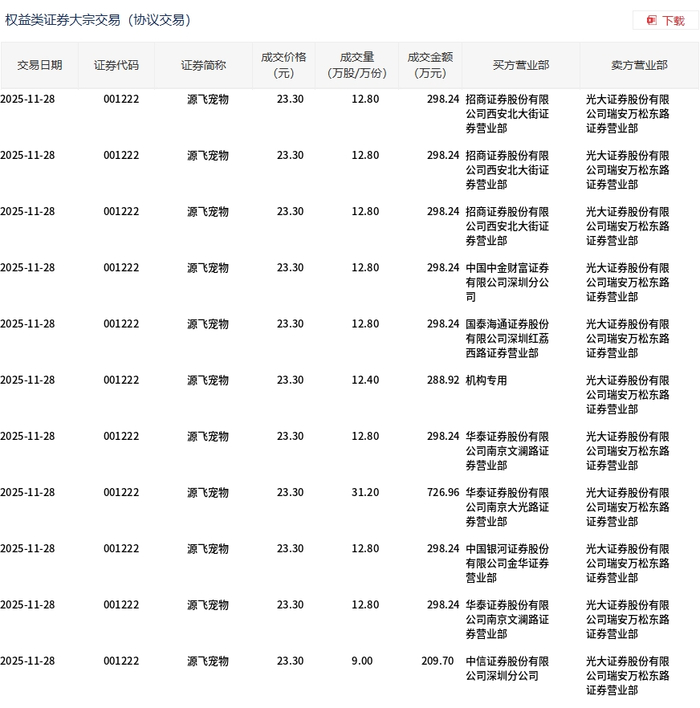 11月28日,源飞宠物大宗交易成交155万股,成交额3611.5万元,占当日总成交额的15.14%,成交价23.3元,较市场收盘价26.22元折价11.14%。
