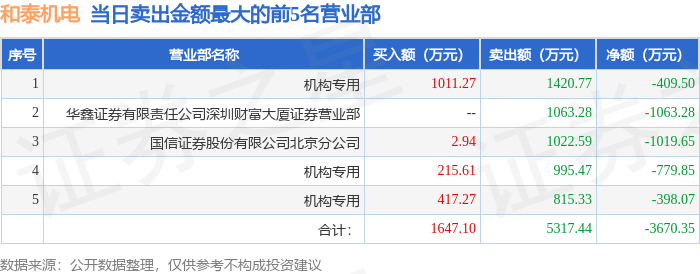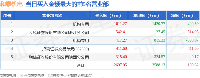 11月19日和泰机电(001225)龙虎榜数据:机构净卖出1587.42万元