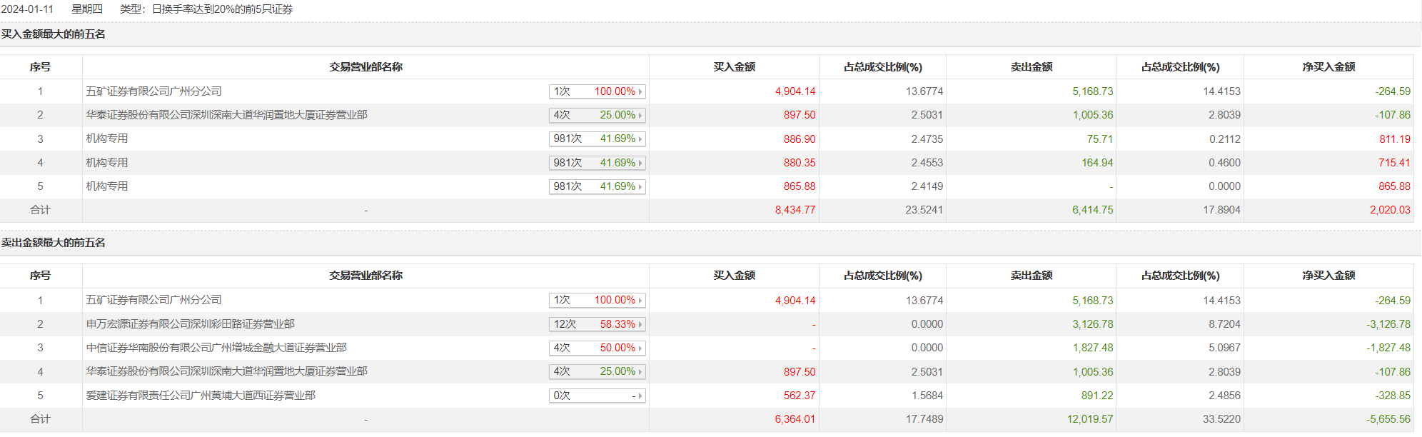 拓山重工1月11日涨9.24%,全天换手率达50.12%,振幅达9.99%。龙虎榜数据显示,营业部席位合计净卖出3263.09万元。其中,机构买入2633.13万元,卖出240.66万元,合计净买入2392.48万元。此外,五矿证券有限公司广州分公司、华泰证券深圳深南大道华润置地大厦证券营业部分别买入4904.14万元、897.50万元;五矿证券有限公司广州分公司、申万宏源证券有限公司深圳彩田路证券营业部分别卖出5168.73万元、3126.78万元。