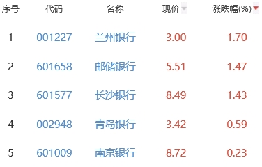其中,兰州银行、邮储银行、长沙银行、青岛银行、南京银行位列板块涨幅前五位,涨幅分别为1.70%、1.47%、1.43%、0.59%、0.23%。