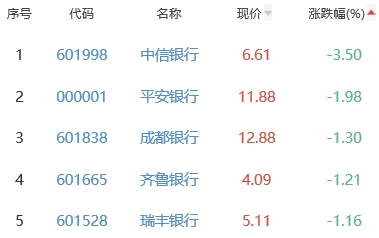 中信银行、平安银行、成都银行、齐鲁银行、瑞丰银行位列涨幅榜后五位,涨幅分别为-3.50%、-1.98%、-1.30%、-1.21%、-1.16%。
