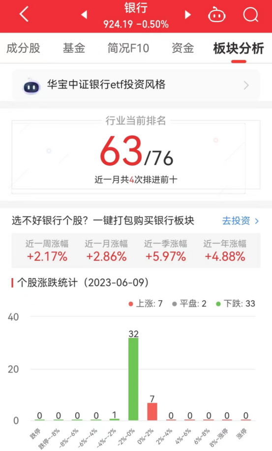 中国经济网北京6月9日讯今日,银行板块整体涨幅-0.50%,其中7只股票上涨,2只股票平盘,33只股票下跌。