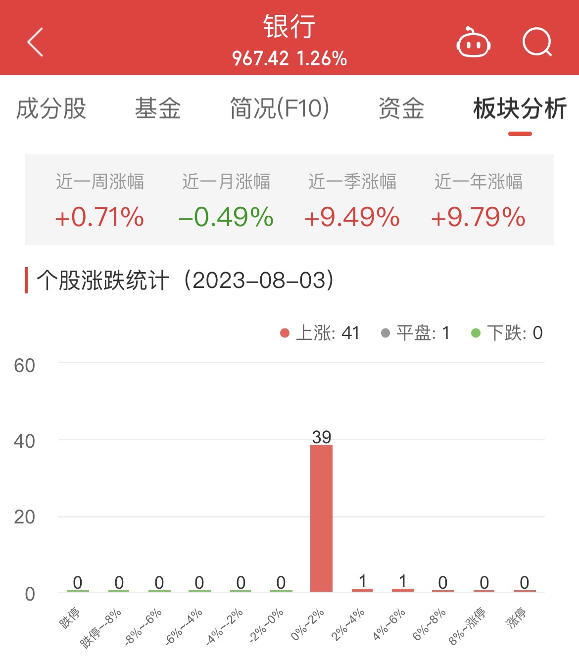 中国经济网北京8月3日讯今日,银行板块整体涨幅1.26%,其中41只股票上涨,1只股票平盘。