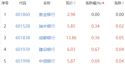 紫金银行、瑞丰银行、成都银行、建设银行和中信银行位列涨幅榜后五位,涨幅分别为0.00%、0.34%、0.36%、0.67%和0.69%。