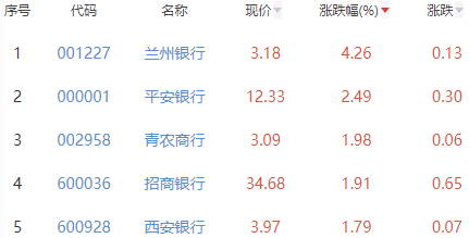 其中,兰州银行、平安银行、青农商行、招商银行和西安银行位列板块涨幅前五位,涨幅分别为4.26%、2.49%、1.98%、1.91%和1.79%。