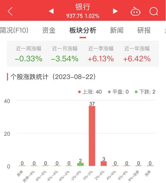 中国经济网北京8月22日讯今日,银行板块整体涨幅1.02%,其中40只股票上涨,0只股票平盘,2只股票下跌。