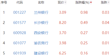 其中,兰州银行、长沙银行、西安银行、渝农商行和建设银行位列板块涨幅前五位,涨幅分别为0.98%、0.49%、0.27%、0.25%和0.16%。