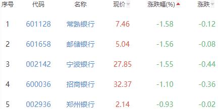常熟银行、邮储银行、宁波银行、招商银行和郑州银行位列涨幅榜后五位,涨幅分别为-1.58%、-1.56%、-1.55%、-1.10%和-0.93%。