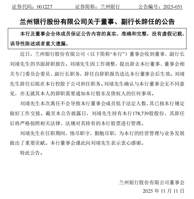 股份有限公司关于董事、副行长辞任的公告。刘靖先生因工作调整,提出辞去兰州银行董事、董事会相关专门委员会委员、副行长职务。