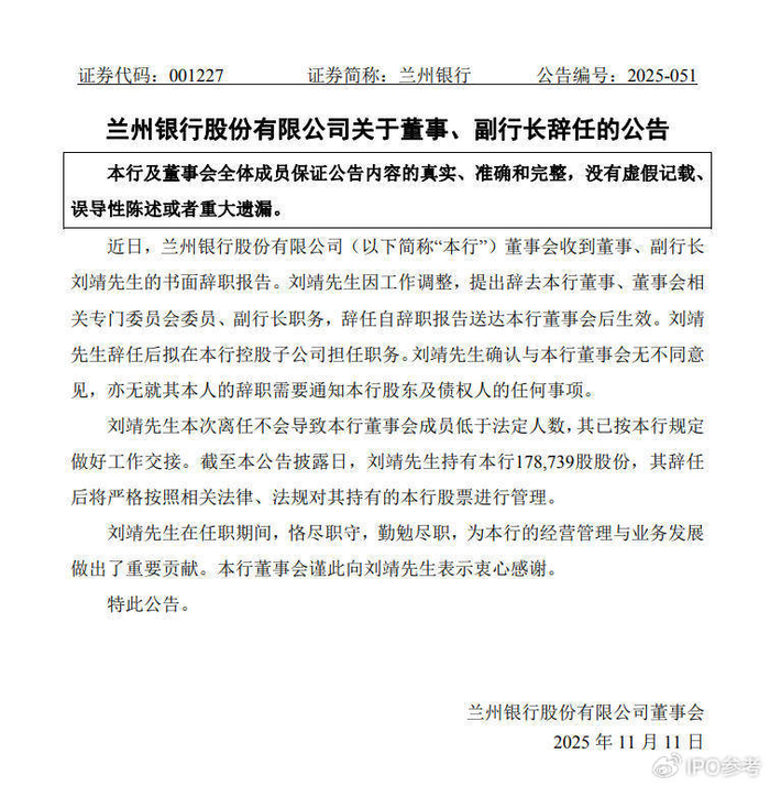 11月11日,兰州银行股份有限公司(001227.SZ,下称“兰州银行”)发布公告称,近日,董事会收到董事、副行长刘靖的书面辞职报告。刘靖因工作调整,提出辞去董事、董事会相关专门委员会委员、副行长职务,辞任自辞职报告送达董事会后生效。刘靖辞任后拟在兰州银行控股子公司担任职务。刘靖确认与董事会无不同意见,亦无就其本人的辞职需要通知兰州银行股东及债权人的任何事项。