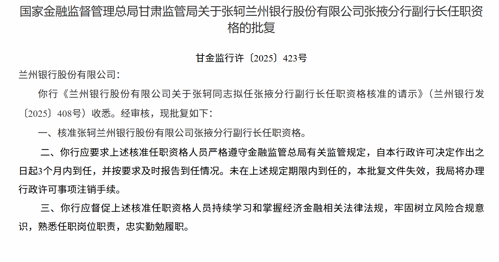 股份有限公司张掖分行副行长任职资格的批复,核准张轲兰州银行股份有限公司张掖分行副行长任职资格。