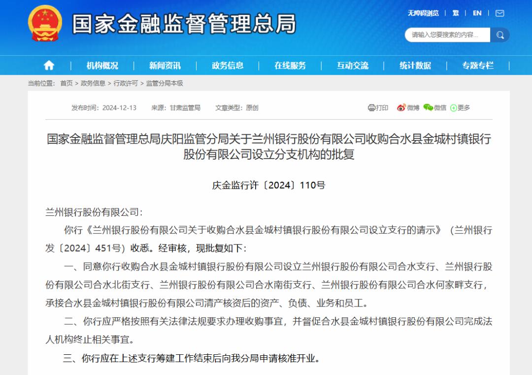 2024年12月,国家金融监督管理总局批准了兰州银行收购合水县金城村镇银行和甘肃西固金城村镇银行的申请。