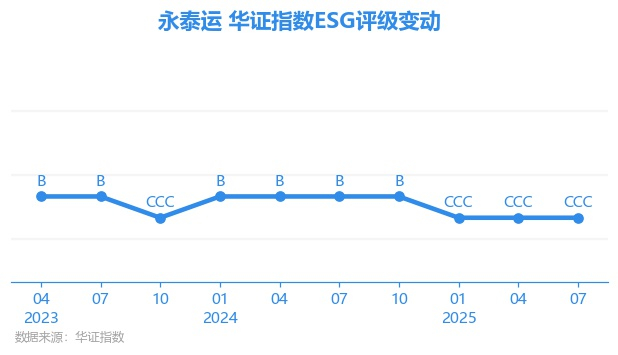 日前,华证指数公布了新一期(2025年7月31日)的ESG评级结果,永泰运(001228.SZ)获得CCC评级(华证指数评级为C起至AAA九档,C为最低档,AAA为其最高一级评级/AA为其第二档),上一期(2025年4月30日)ESG评级为CCC。本期ESG评级在34家航空货运与物流行业A股上市公司中排名第32(上一期排名第34)。