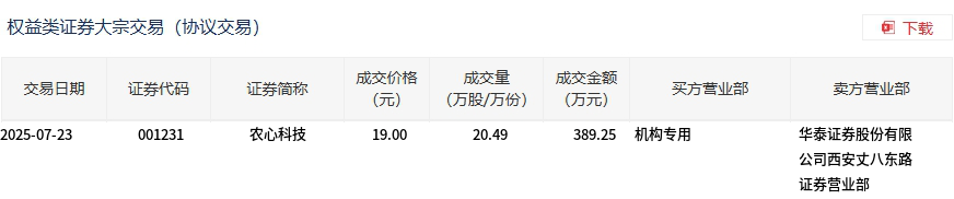 农心科技今日大宗交易折价成交20.49万股,成交额389.25万元