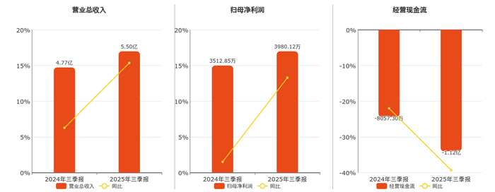 公司营业总收入为5.50亿元,在已披露的同业公司中排名第39。归母净利润为3980.12万元,在已披露的同业公司中排名第28。经营活动现金净流入为-1.12亿元,在已披露的同业公司中排名第38,较去年同报告期经营活动现金净流入减少3165.96万元。