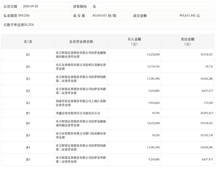 9月20日,弘业期货今日涨停,龙虎榜数据显示,上榜营业部席位全天成交1.19亿元,占当日总成交金额比例为13.18%。其中,买入金额为5967.88万元,卖出金额为5967.65万元,合计净买入2315元。